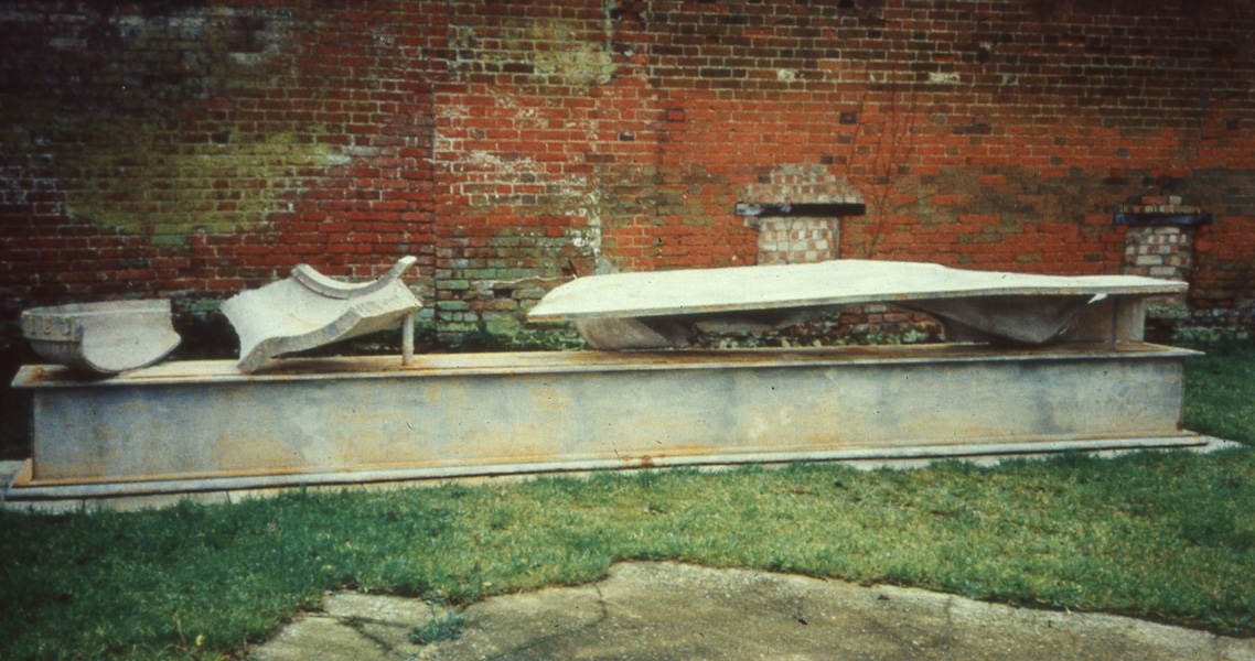 The freedom from structural constraints which the plinths allowed meant that they could be stretched to large dimensions. Between 1991 and 1992 Foster produced a group of very long sculptures, first at Hardingham, and then later at Triangle Workshop, New York State. The drama of Bone China or Drum Solo came from a strongly stated contrast between the still and stable plinths and the enlivened rising serpentine curves of steel the plinths supported. In these later sculptures the contrast is less marked. The plinths generally support only two or three discrete upper elements, which sit low on top of the plinths. Shallow curves, either cut from large steel pipes or bowls, or made by distorting sections of plate or I-beam, mimic this linearity, creating a fluid or somehow sped-up version of it. In Straight Edge on Sloping Base the visual identities of plinth and upper elements are partially reversed; whilst in one of the untitled sculptures made at Triangle the plinth itself is raised off the ground so it appears to float. The main aim of the sculptures seems to have been to accentuate the length of the plinths, to make them seem longer than they are, and to use this length to heighten the effect of a small number of very precise decisions (the particular tilt on this found piece of industrial steel, the height at which an element ‘hovers’). The profile drawing of the Cut-Outs reaches its most elegant conclusion in what are Foster’s most fully aesthetic sculptures.